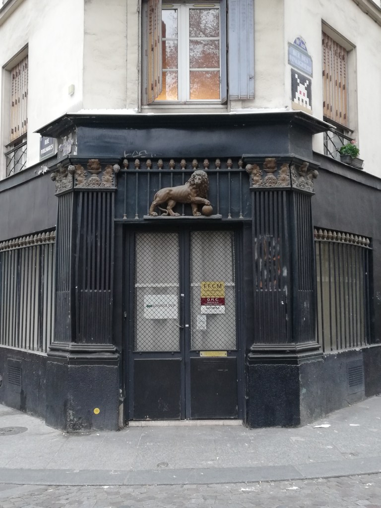 Située à l’angle de la rue Jean Poulmarch, cette enseigne date du début du 19è siècle. Elle représente un Llon Medicis doré : le lion, de profil, la patte posée sur un globe, surmonte la porte. La porte est encadrée de pilastres dont les chapiteaux sont ornés de têtes de bacchus entourées de grappes de raisin.