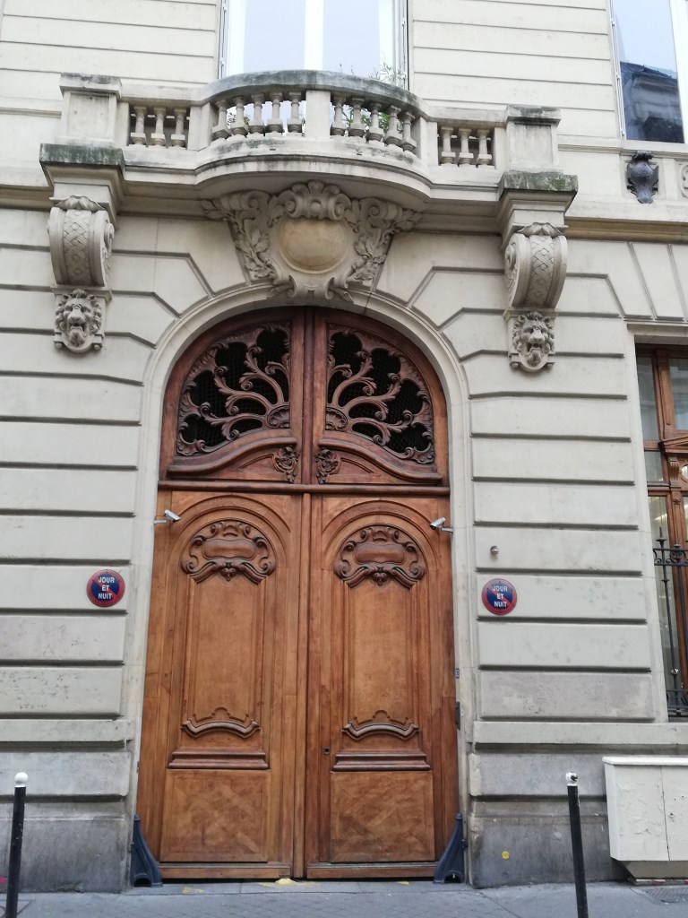 | 171 rue Lafayette | Tympan très décoré d’arabesques et de fleurs. Deux petites têtes de lion encadrent la porte. |