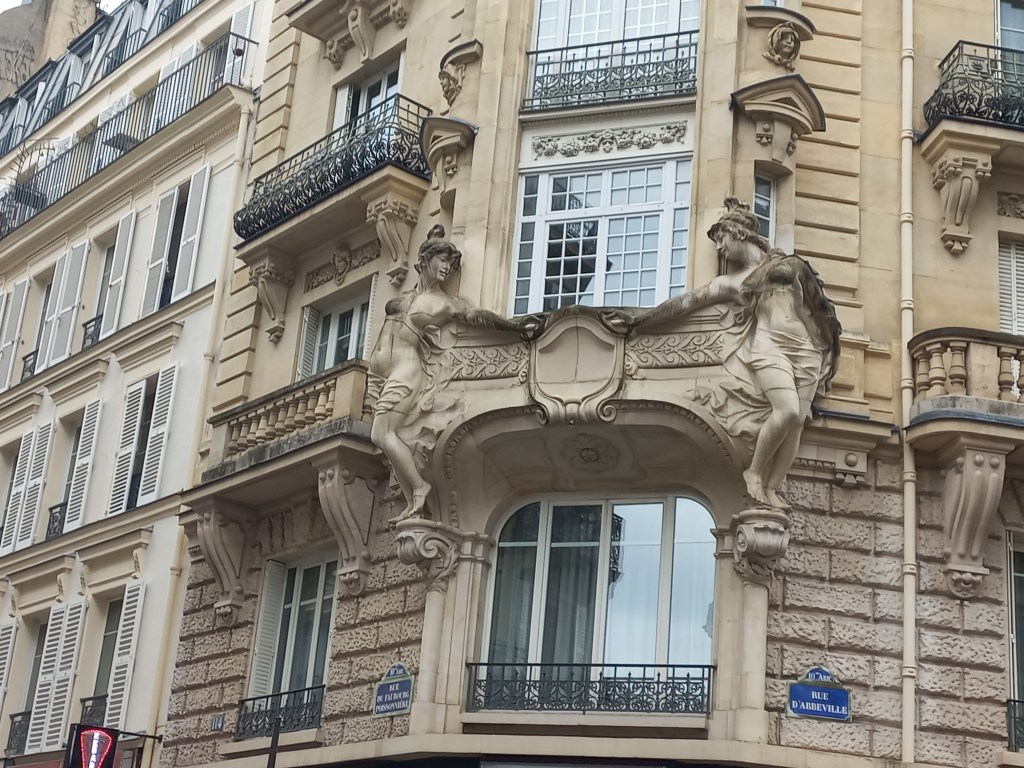 | 16 rue d’Abbeville | Façade remarquable surtout pour ses sculptures monumentales de femmes gracieuses, légèrement déhanchées qui encadrent les deux grands balcons du 1èr étage et qui sont l’œuvre d’Alexandre Dupuy. Très imposantes et très décoratives, elles rappellent les nymphes du 1 rue de l’Yvette dans le 16è : même grâce souriante, légèrement espiègle et ultra-décorative. Architecte |