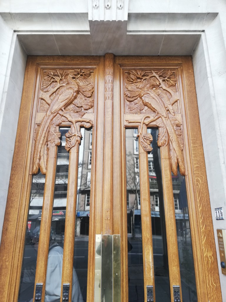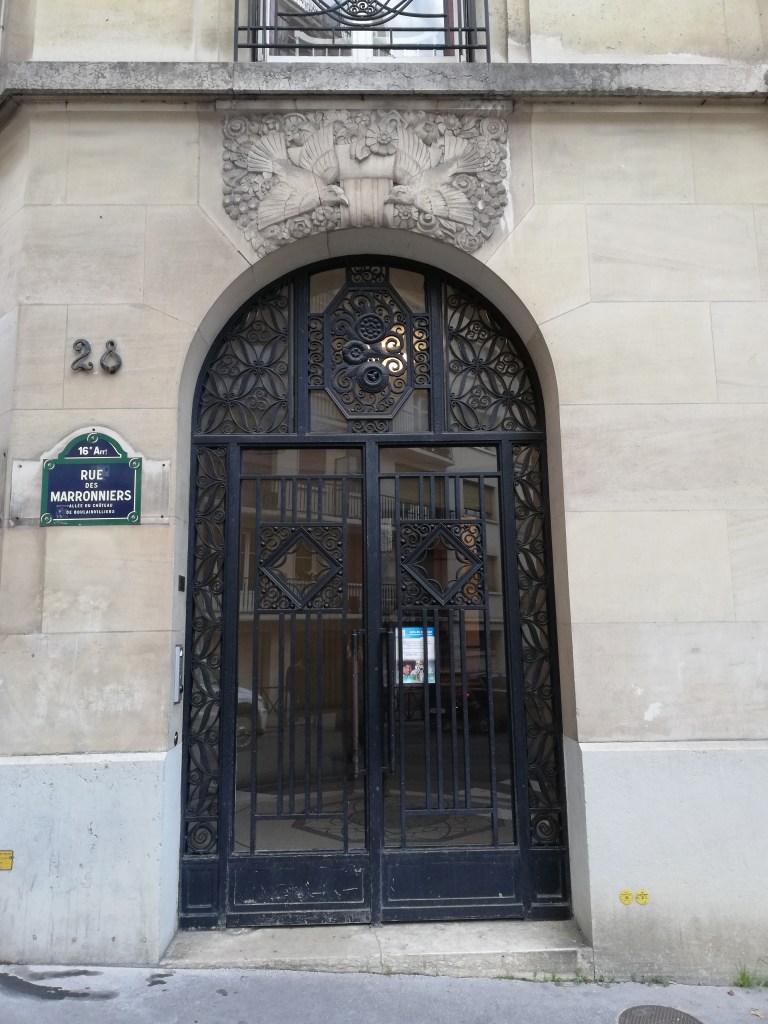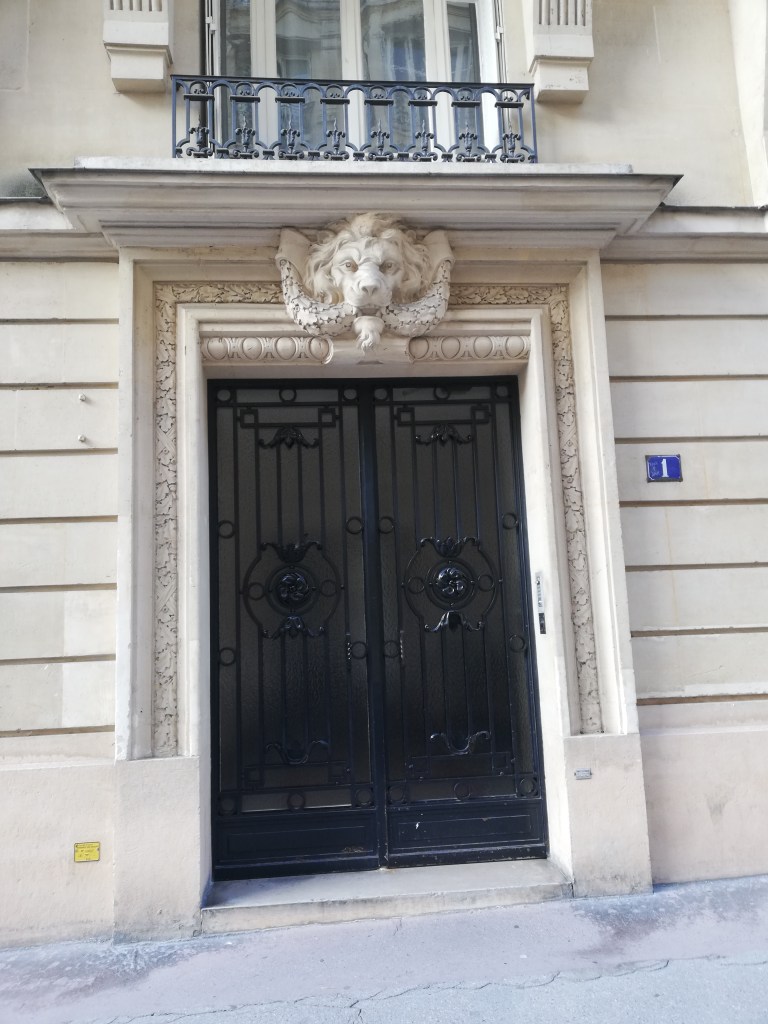 Immeuble Art déco. Porte surmontée d’une énorme couronne de roses et de monnaies du pape.