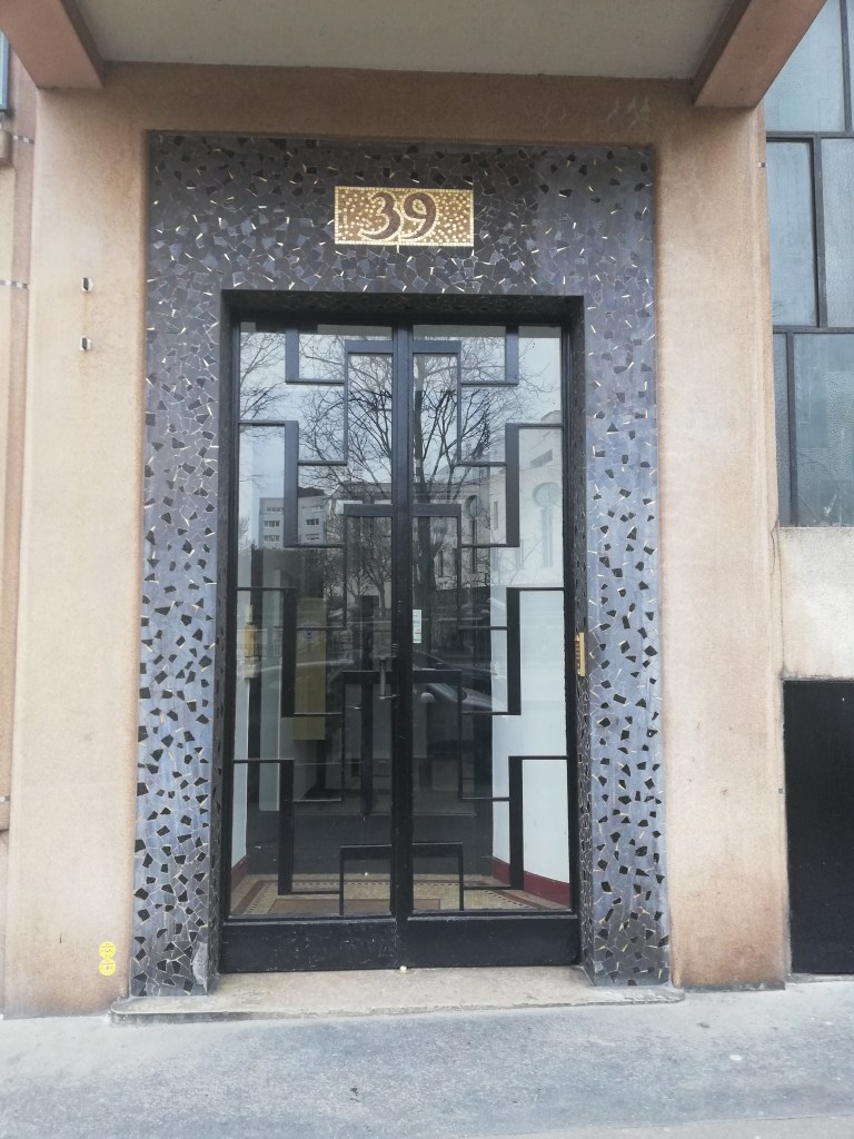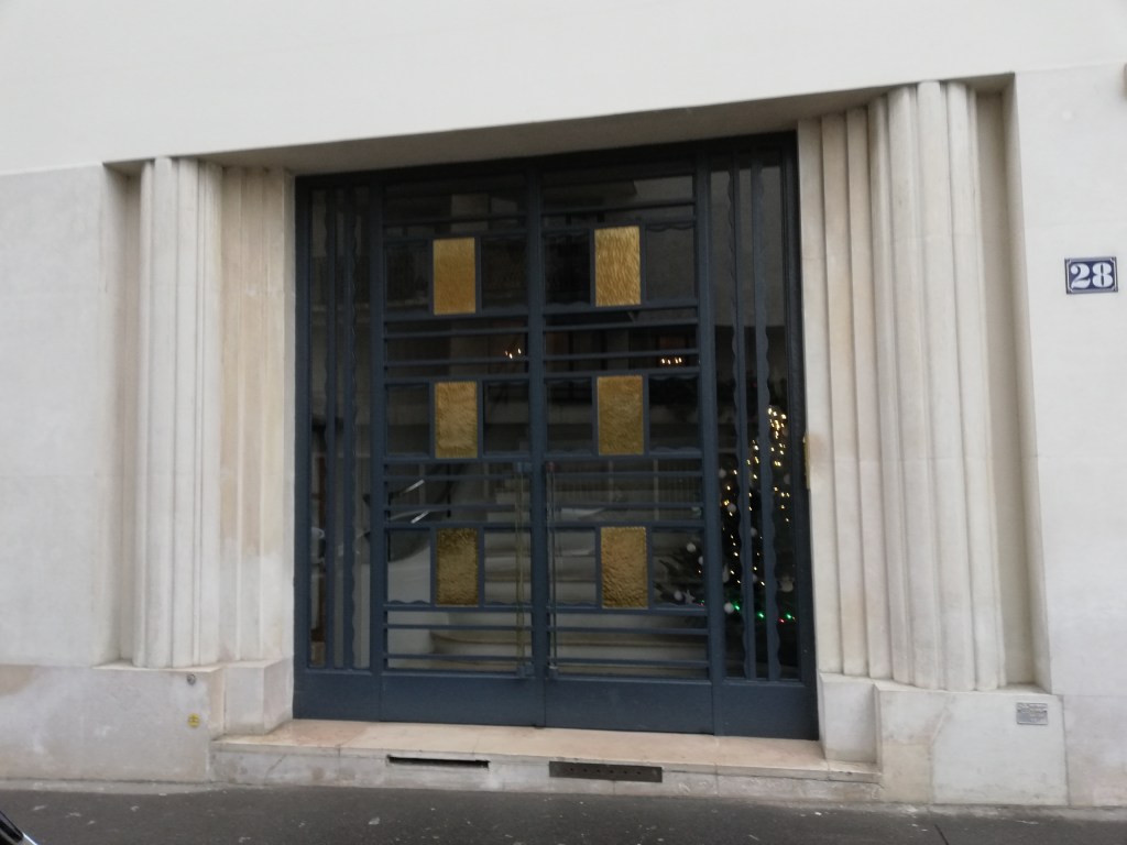 Art déco. Porte en ferronnerie très géométrique, ornée de rectangles en cuivre martelé et encadrée de deux colonnes cannelées.