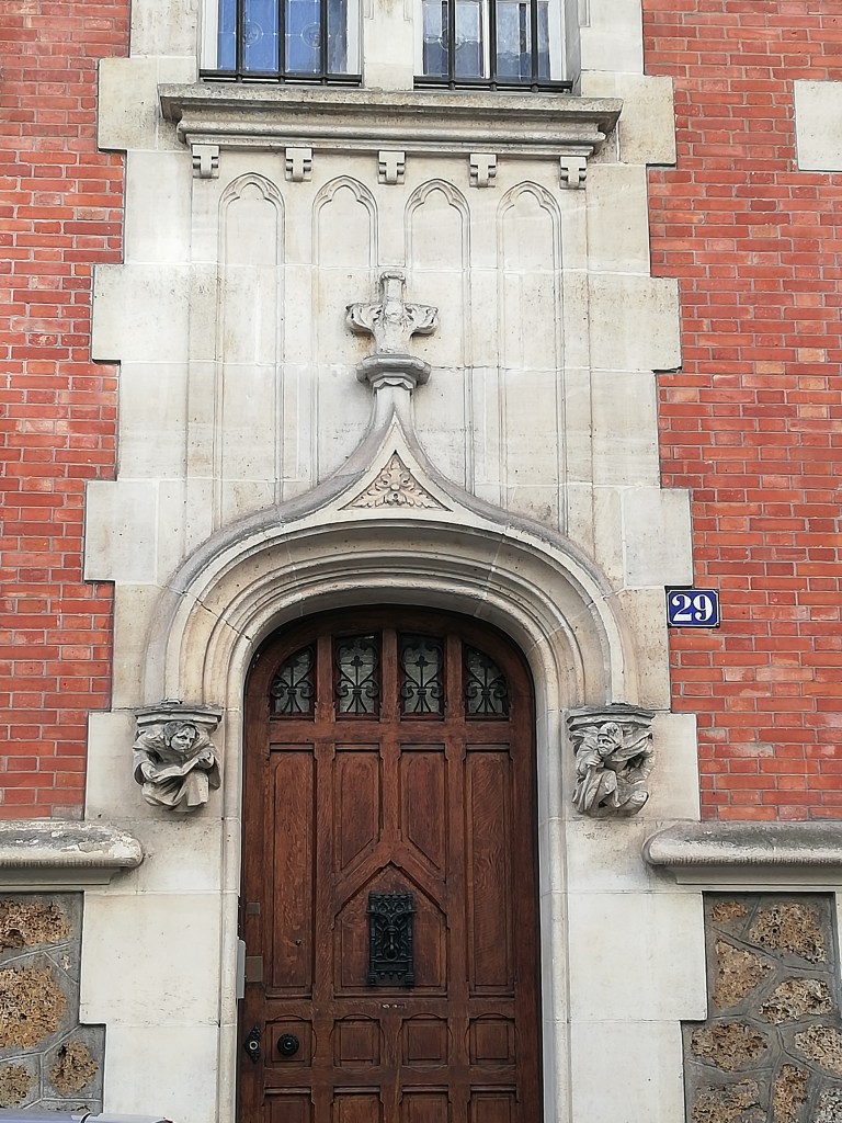 Petite porte d’hôtel particulier néo gothique, avec deux petits personnages en console qui soutiennent le gâble. A gauche, un moine tenant un livre sur ses genoux, à droite un soldat assis appuyé sur son épée.