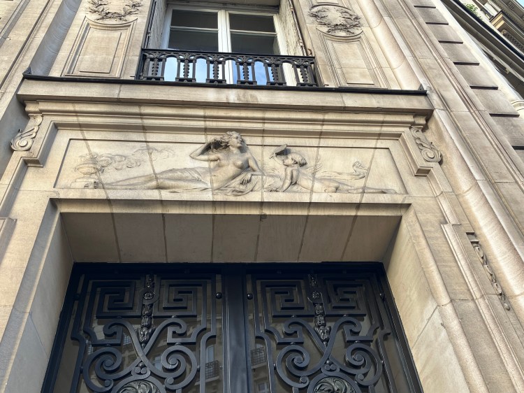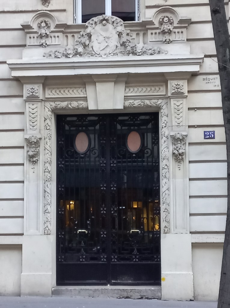| 9 rue Louis Boilly | Deux chats descendent le long des feuillages de la ferronerie de la porte. Guirlande de roses sur le linteau de la porte. Immeuble primé au concours des façades de la Ville de Paris en 1914. Architecte Charles Labro |