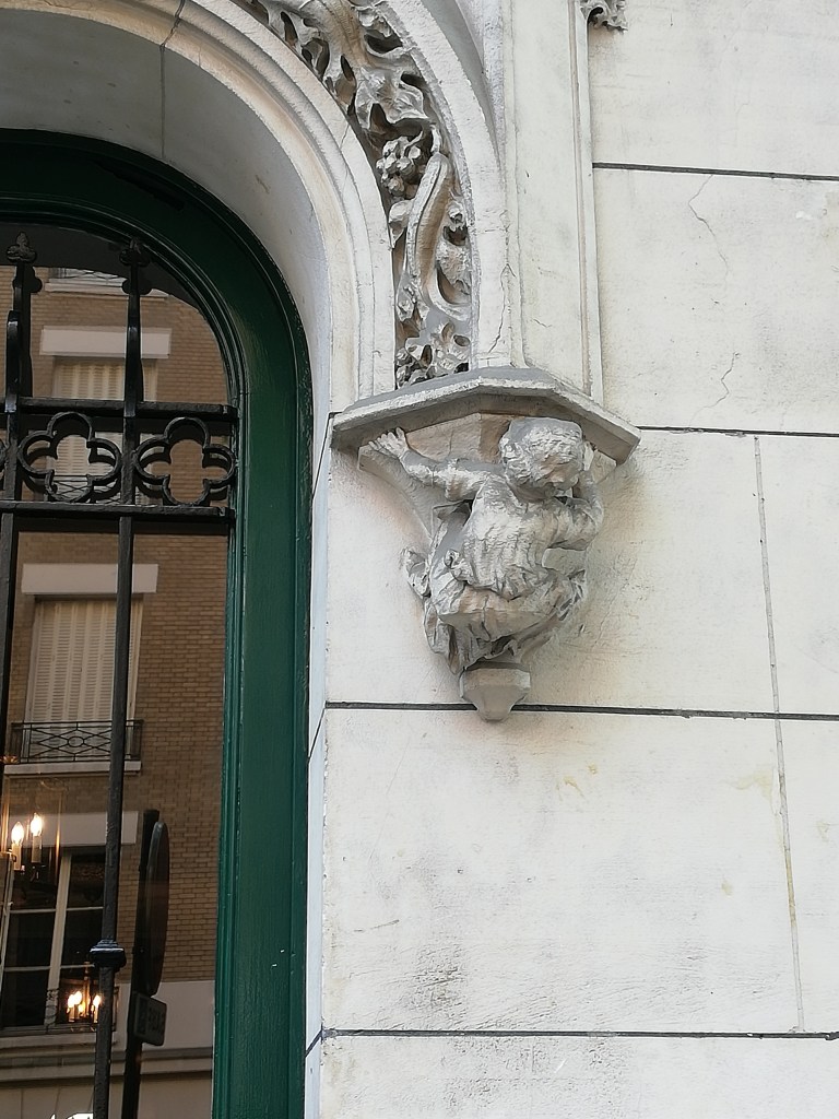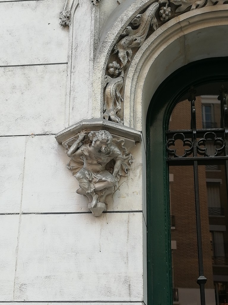 Dessus de porte très orné avec une tête de faune souriant encadré de deux petites cornes d’abondance. Architecte E. Bainier. 1901
