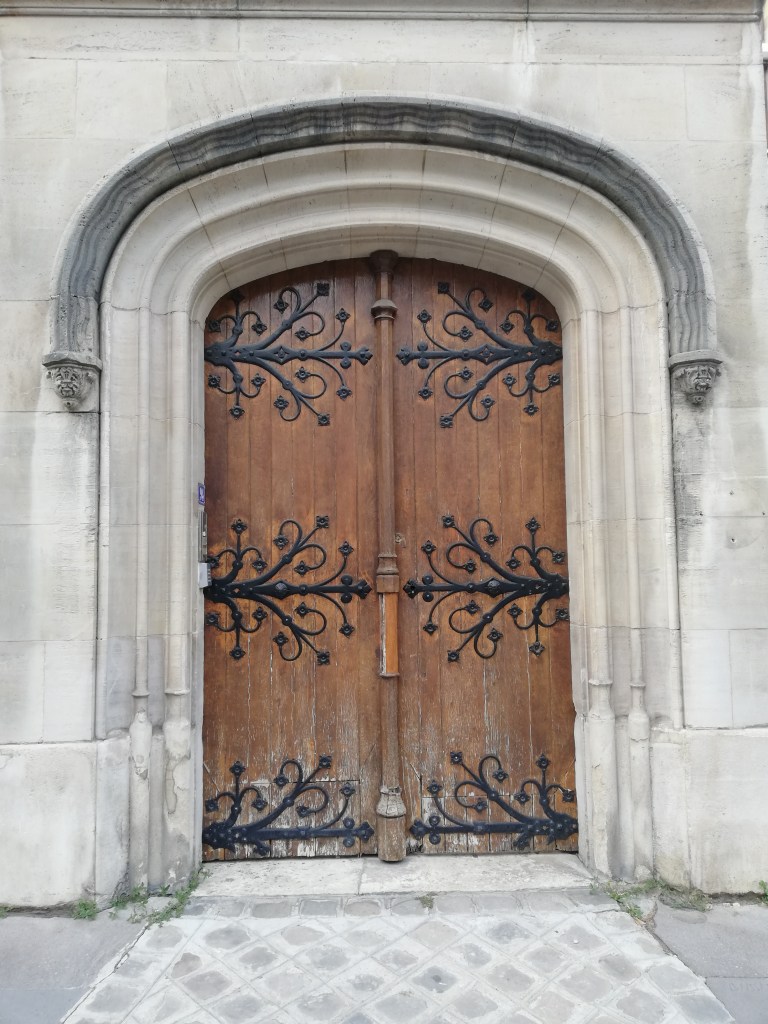 Petite porte néo gothique arrondie avec beaux éléments de ferronnerie sur les battants.