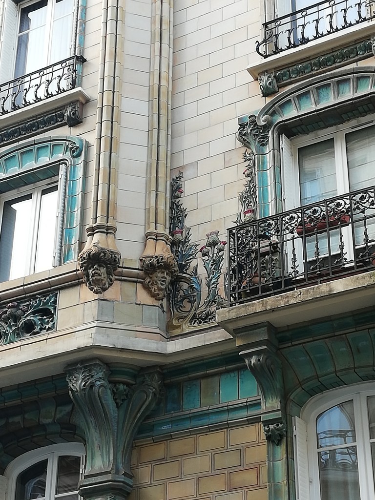| 3 rue Louis Bailly | Art nouveau. Deux femmes émergent de de feuillages type bambou au dessus de la porte. Elles se penchent au-dessous de la porte, semblent regarder les personnes qui entrent et sortent de l’immeuble. Leurs têtes se touchent. |