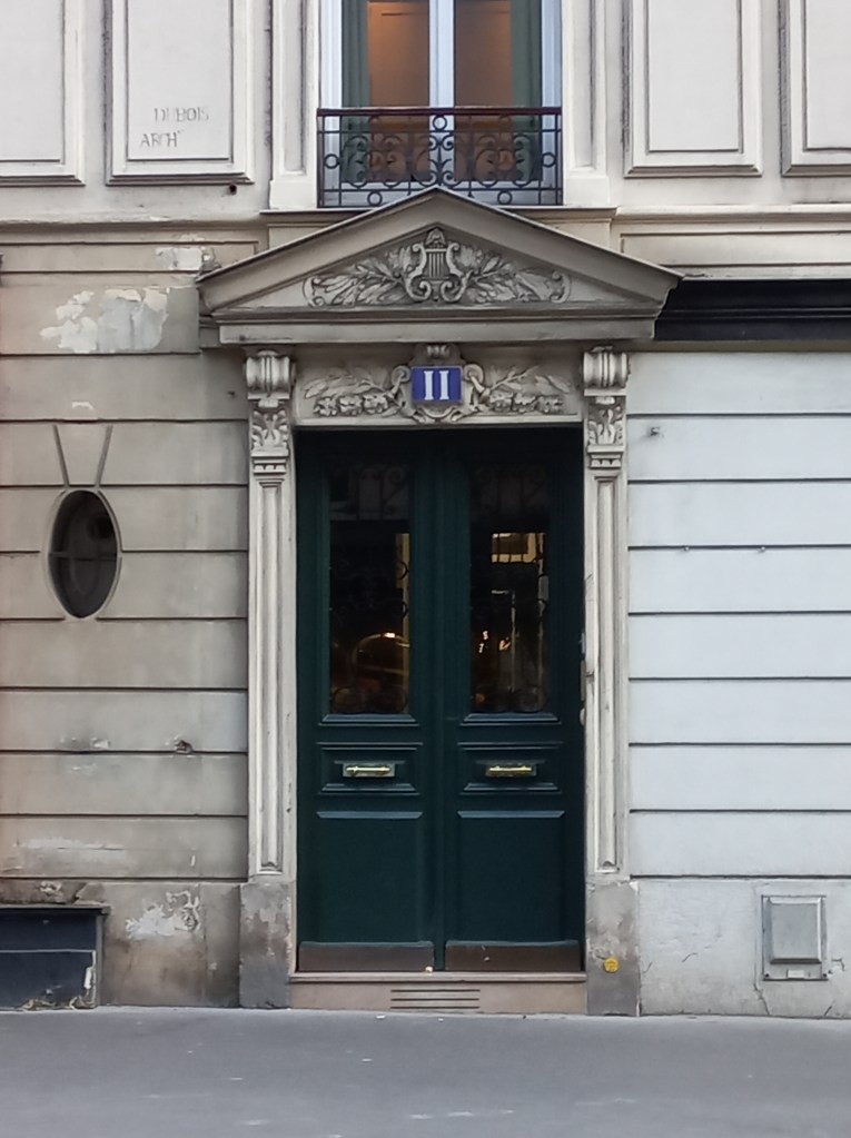 Le linteau de cette porte est dédiée à la guerre avec ces guirlandes de feuilles de chêne et de laurier tandis que le fronton triangulaire est dédié à la paix avec cette lyre sur fond de branches d’olivier. Amusant petit œil de bœuf à gauche de la porte. Architecte Dubois