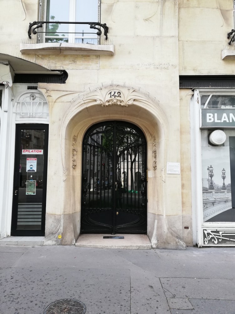 | 55 rue Molitor | Un grand motif de coquille entouré de lentilles d’eau orne l’encadrement de la porte qui est surmontée d’un motif évoquant une coque de bateau qui soutient un balcon. Au-dessus de la fenêtre extraordinaire mascaron représentant une figure masculine dont la barbe semble fouettée par le vent. La chevelure est ornée de plantes aquatiques. On aperçoit des bambous qui dépassent des cheveux. |