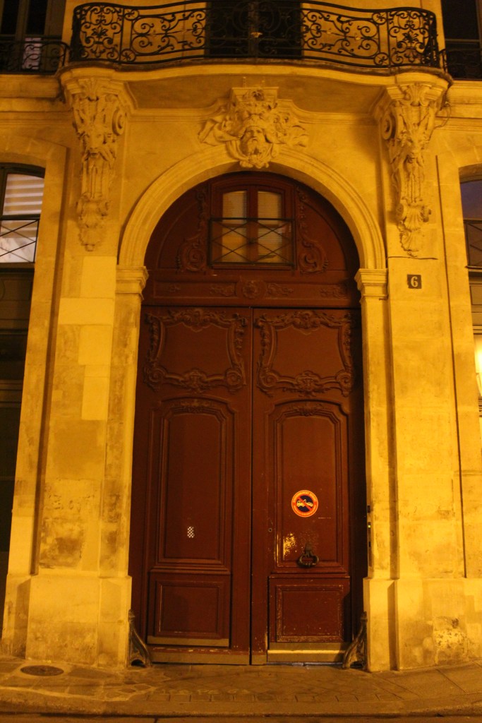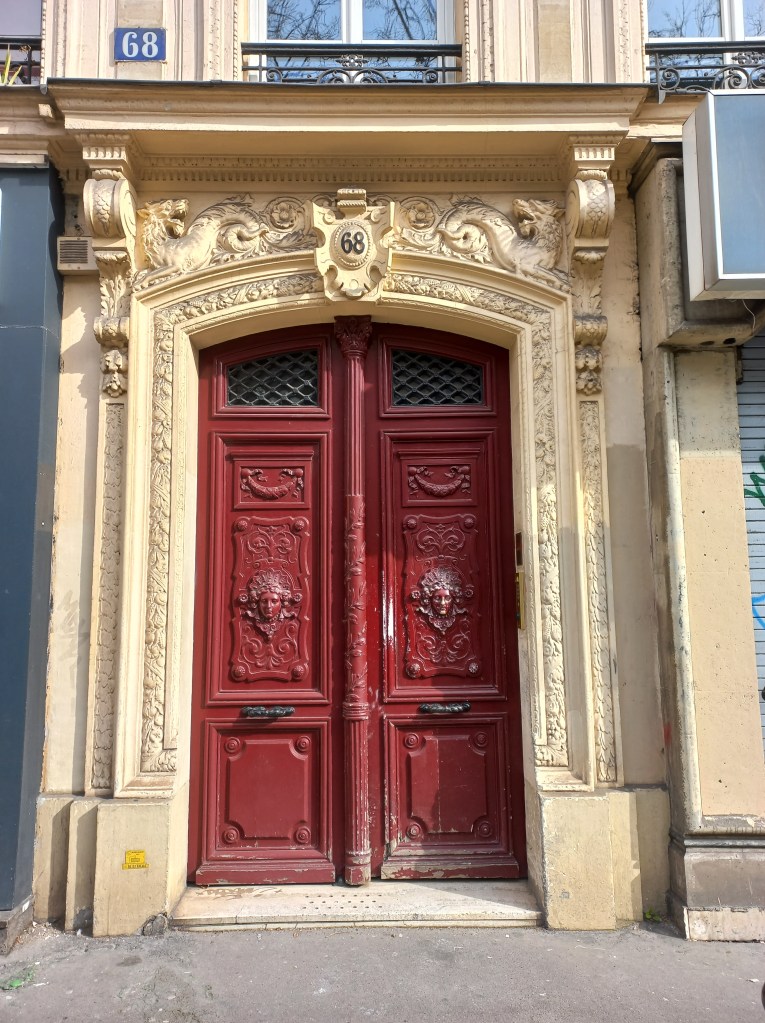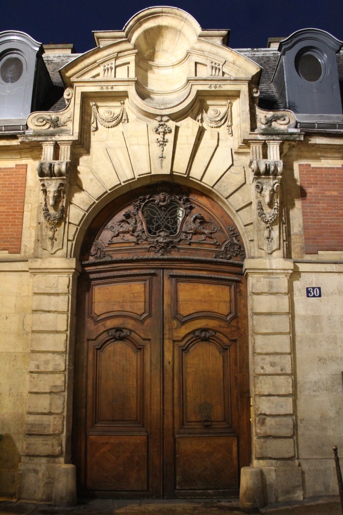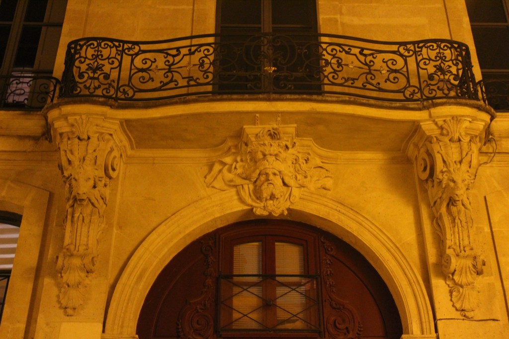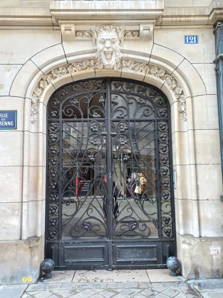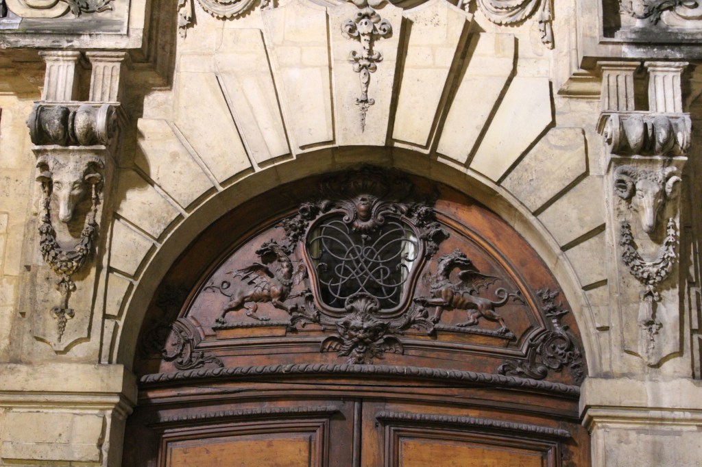 Porte étonnante avec des deux ferronneries en forme d’ogive au-dessus des battants de la porte. Le linteau est flanqué de deux paires de petites consoles sculptées de petits bustes masculins moustachus et barbus.