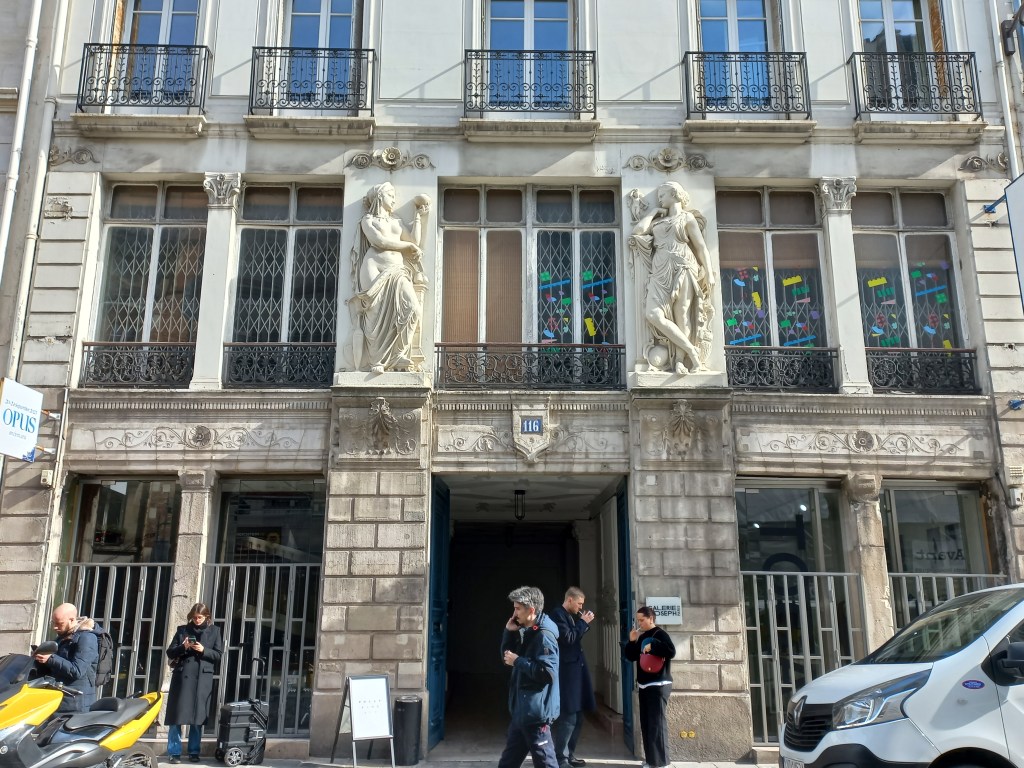 Rinceaux au-dessus de la porte et des fenêtres sur rez-de-chaussée. Deux grands bas-reliefs représentant des figures féminines encadrent la fenêtre du 1er étage.