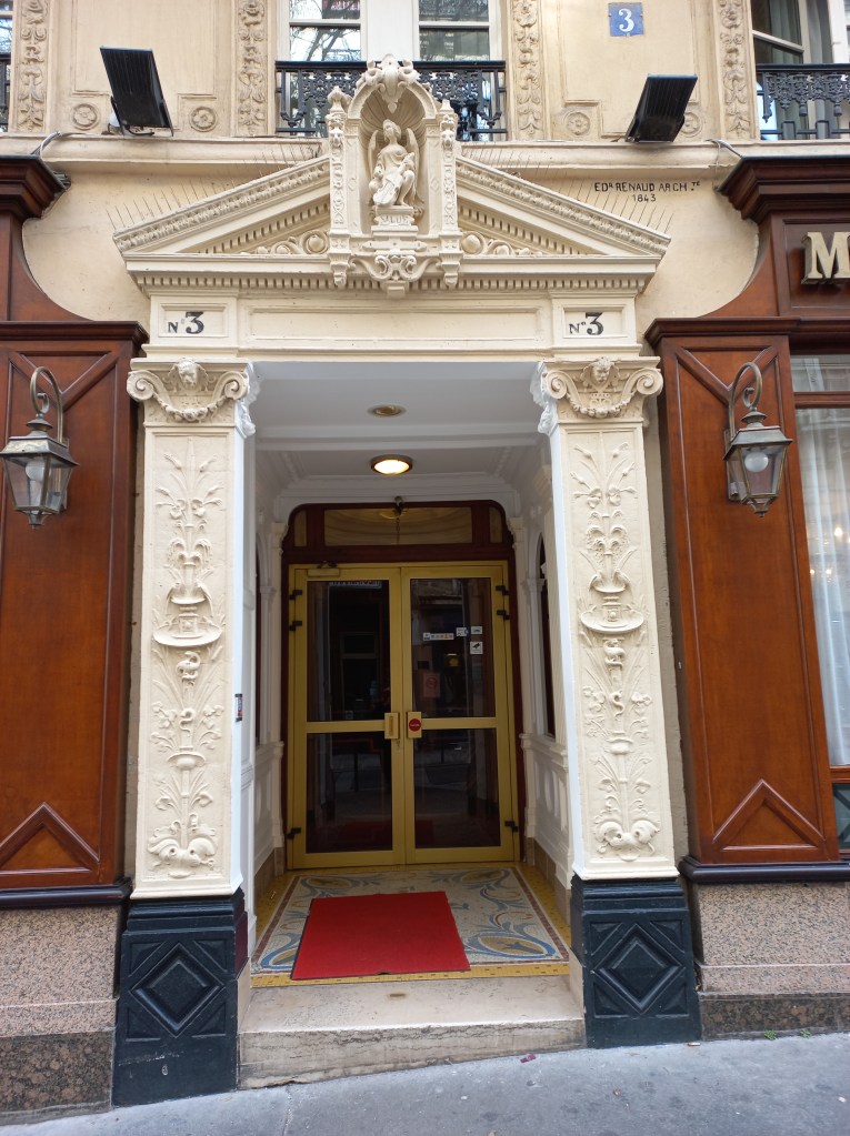 | 57 rue de Turbigo | Immense cariatide ou ange qui s’étire sur 3 étages et qui soutient un balcon de sa tête et de ses deux ailes. Elle tient un brin de myrrhe et une bourse. Sculpteur Auguste Delange. 1859 |