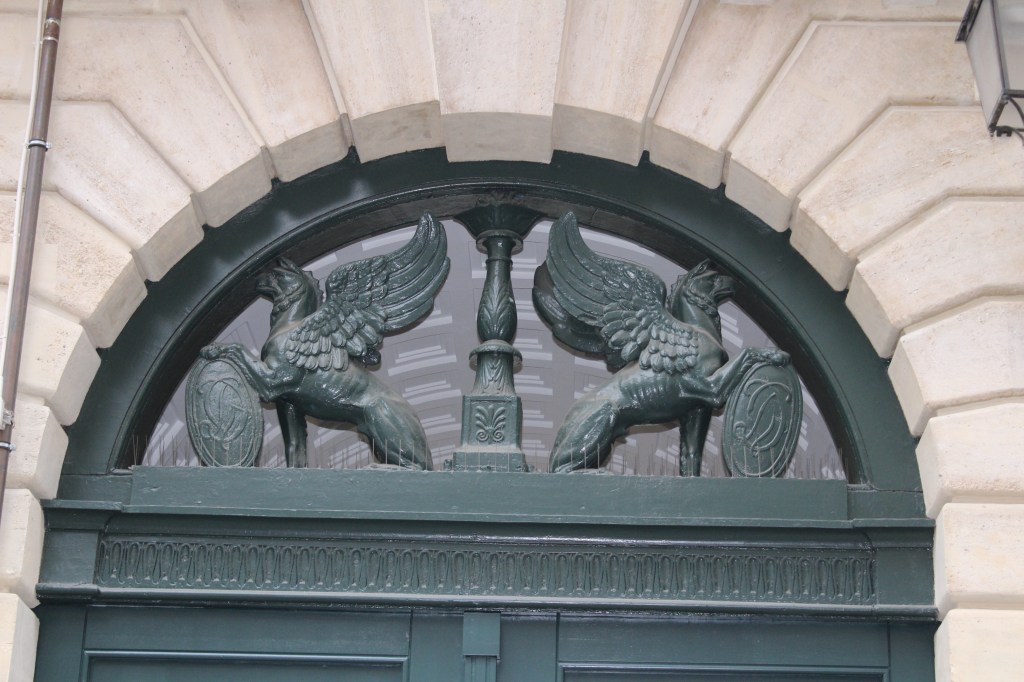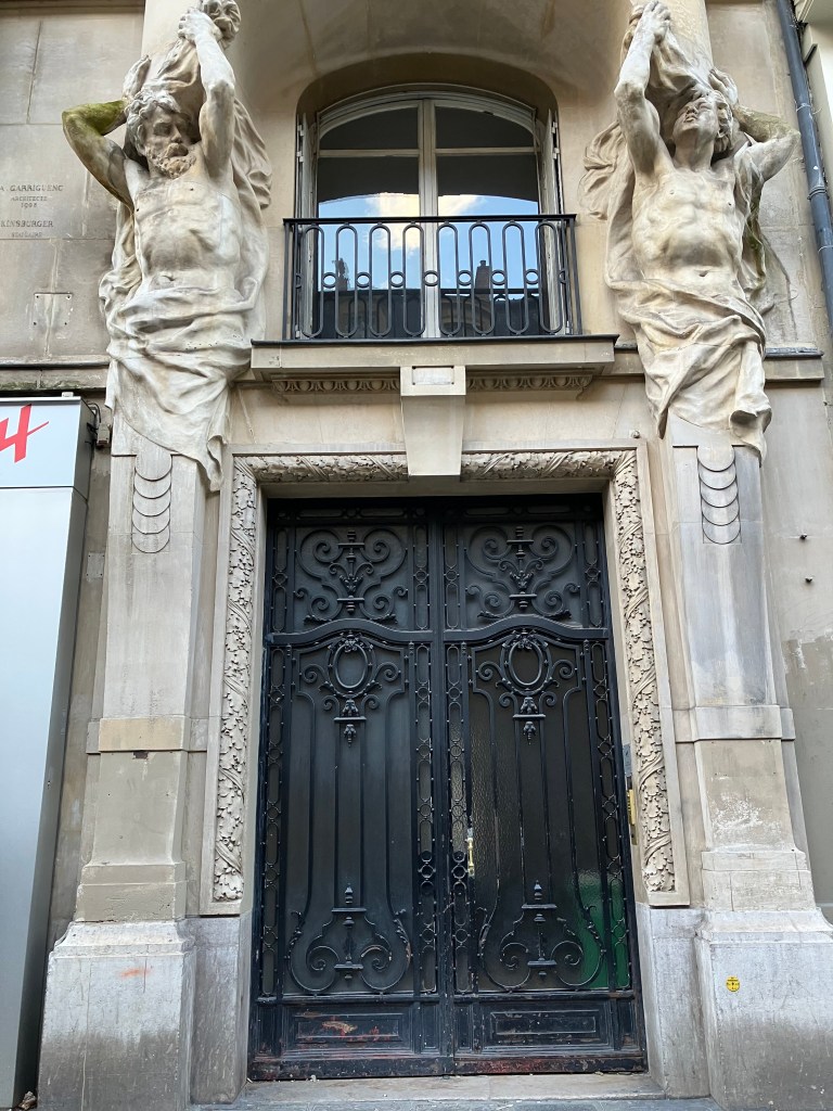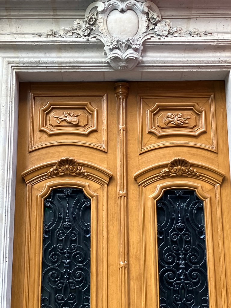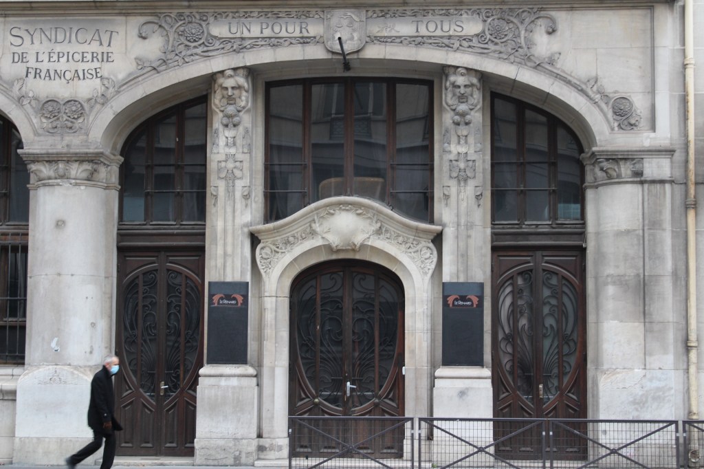 Syndicat de l’épicerie française. Portes très ouvragées avec quelque chose d’art nouveau dans les vantaux.