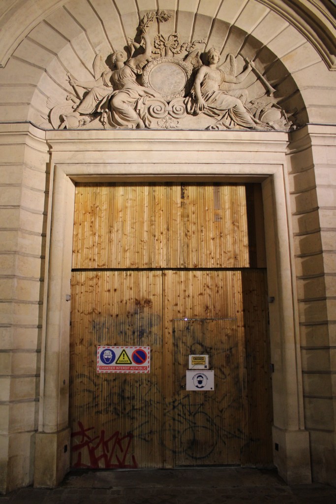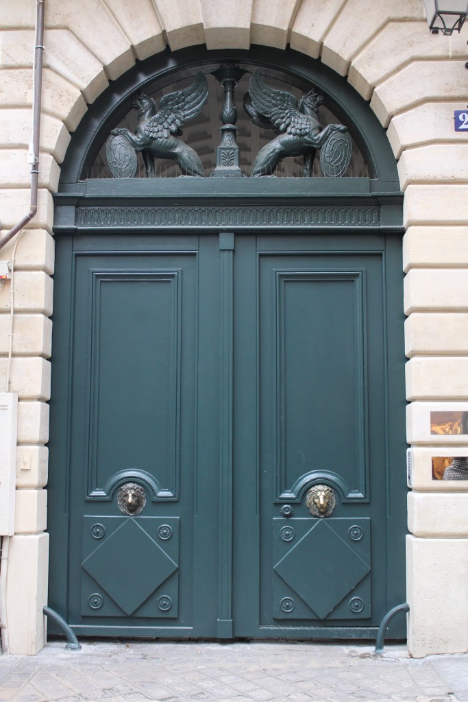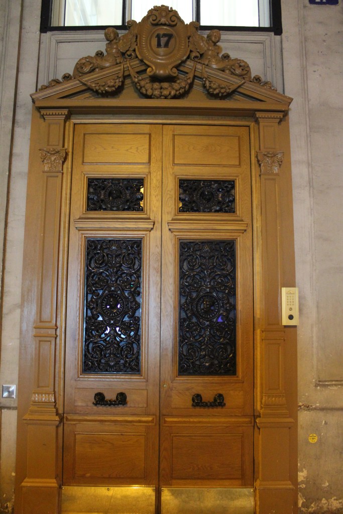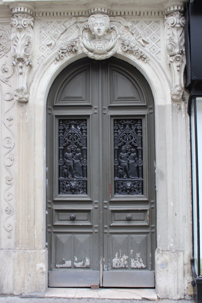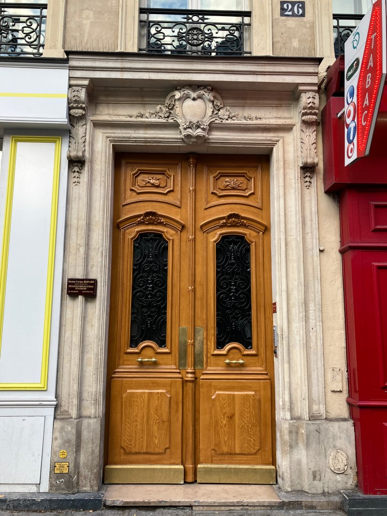 Syndicat de l’épicerie française. Portes très ouvragées avec quelque chose d’art nouveau dans les vantaux.
