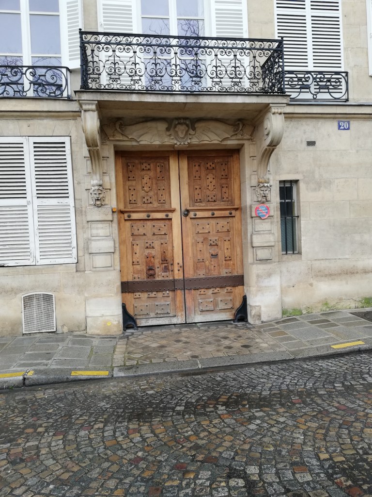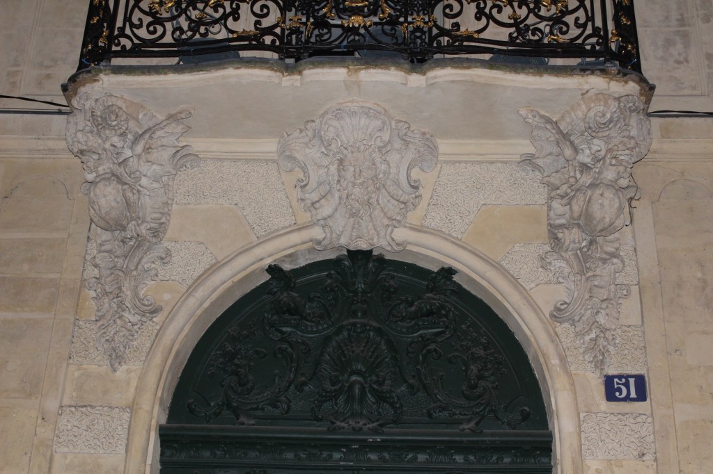Linteau orné d’un curieux mascaron féminin avec deux grandes ailes déployées. Les deux consoles qui soutiennent le balcon sont terminées par deux petites figures de faune. Très belle porte cloutée.