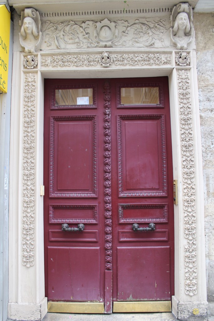 Encadrement de porte néo-renaissance. Rinceaux sur le linteau et l’encadrement de la porte. Trois petits bustes animent le dessus de la porte. Le linteau est encadré de deux figures en saillie qui forment des consoles.