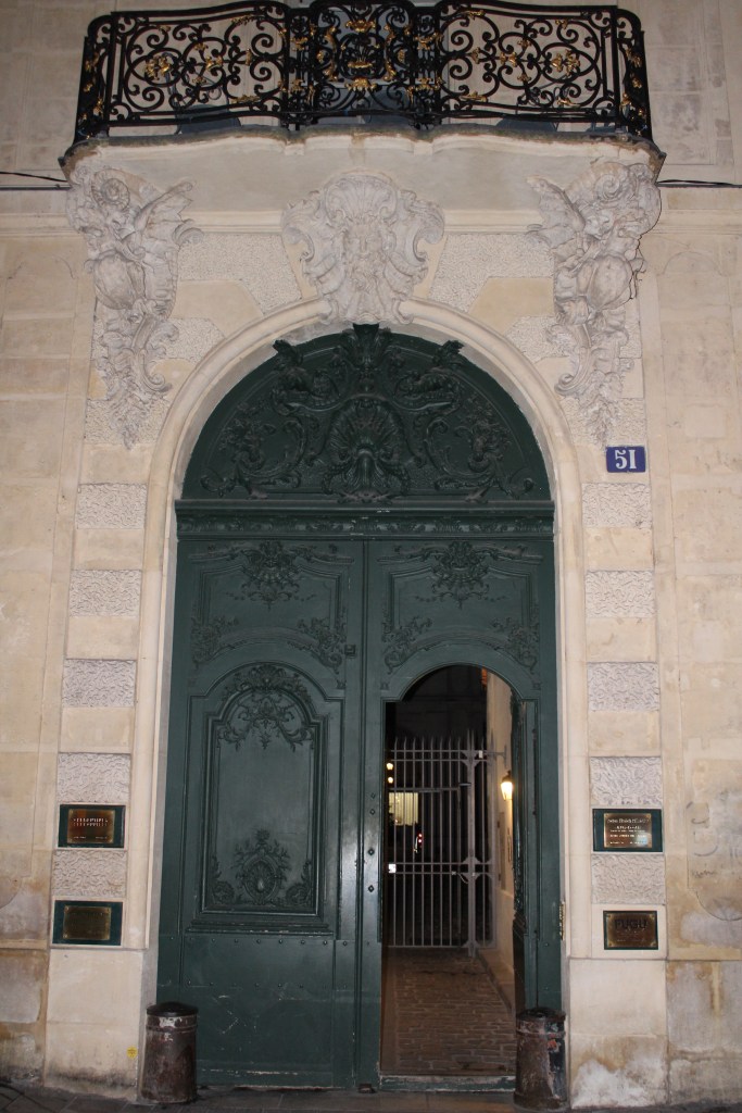 | 6 impasse Guéménée | Grande porte cochère surmontée d’un fronton triangulaire orné d’un amoncellement d’objets qui semblent dédié aux arts et à la science avec des bustes, une mappemonde, des livres… |