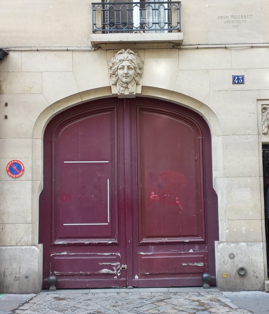 Hercule… féminin ! C’est bien un mascaron représentant Hercule coiffée de la peau du lion de Némée qui orne la clé de cette porte cochère, mais un Hercule aux traits très féminins ! Architecte : Henri Rousset. 1912