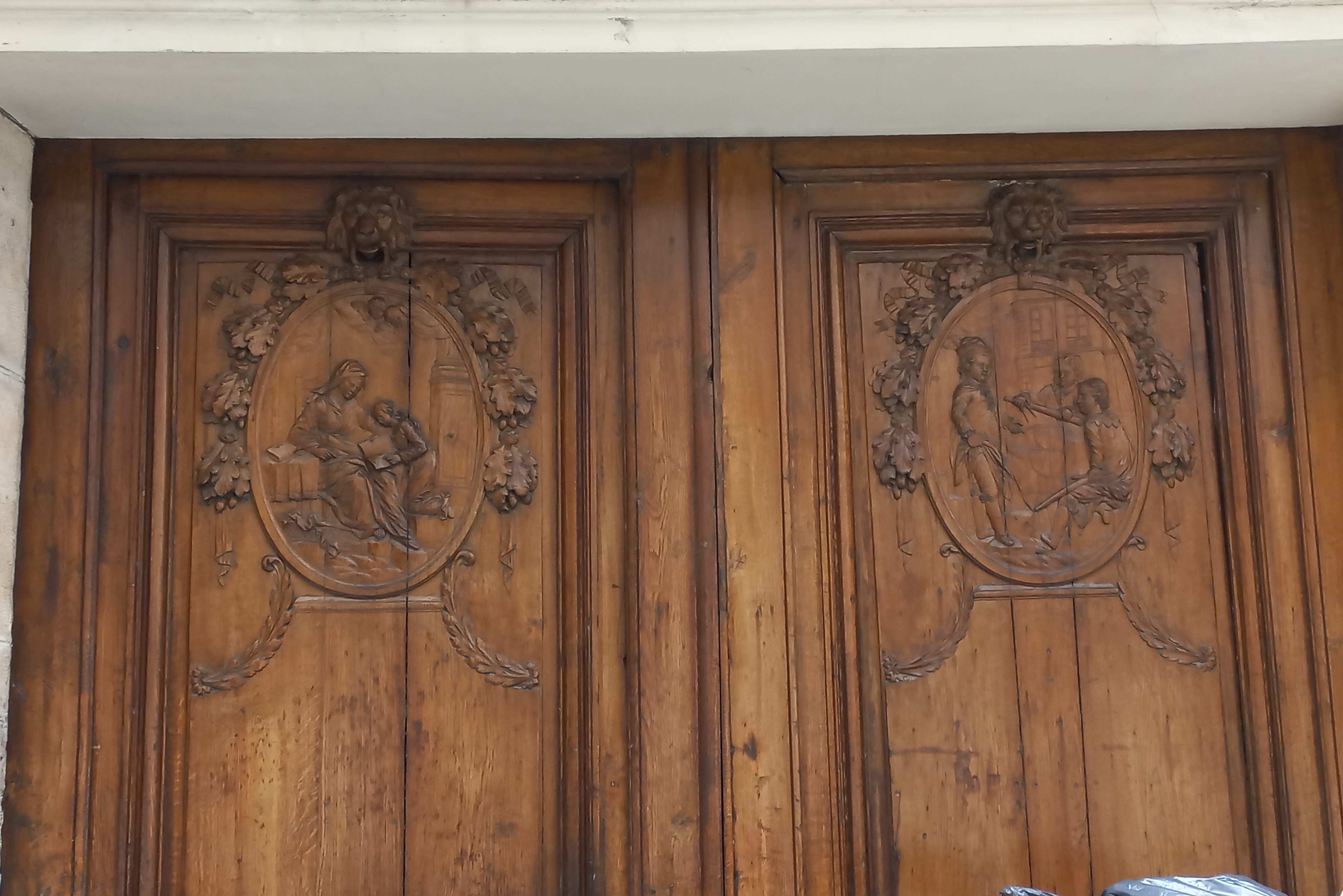 Vantaux finement sculptés de deux médaillons représentant, à gauche, Sainte Anne instruisant la Sainte Vierge et, à droite, Jean-Nicolas Servandoni montrant le plan de Saint Sulpice. Il était l’architecte de Saint Sulpice.