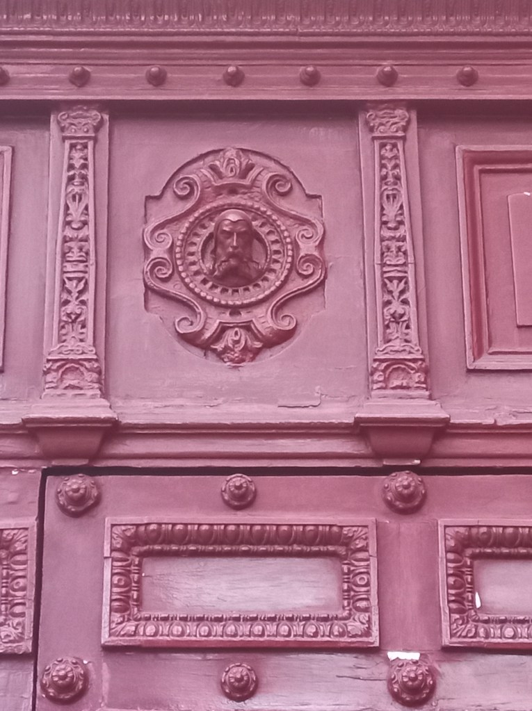 Porte au décor néo-renaissance très chargé. Petites têtes masculines et féminines en saillie. En haut de la porte, un buste masculin ressemble curieusement à la figure du Christ