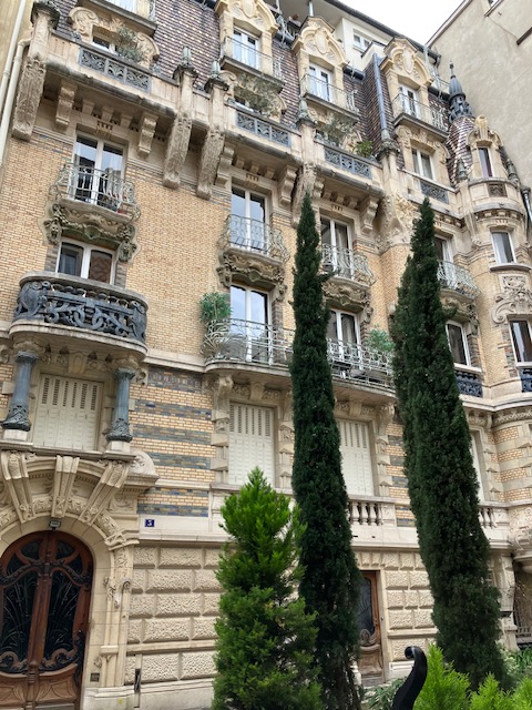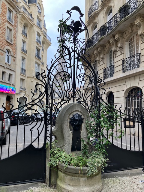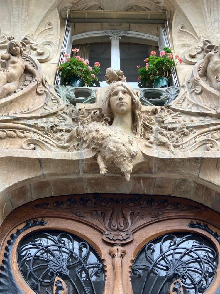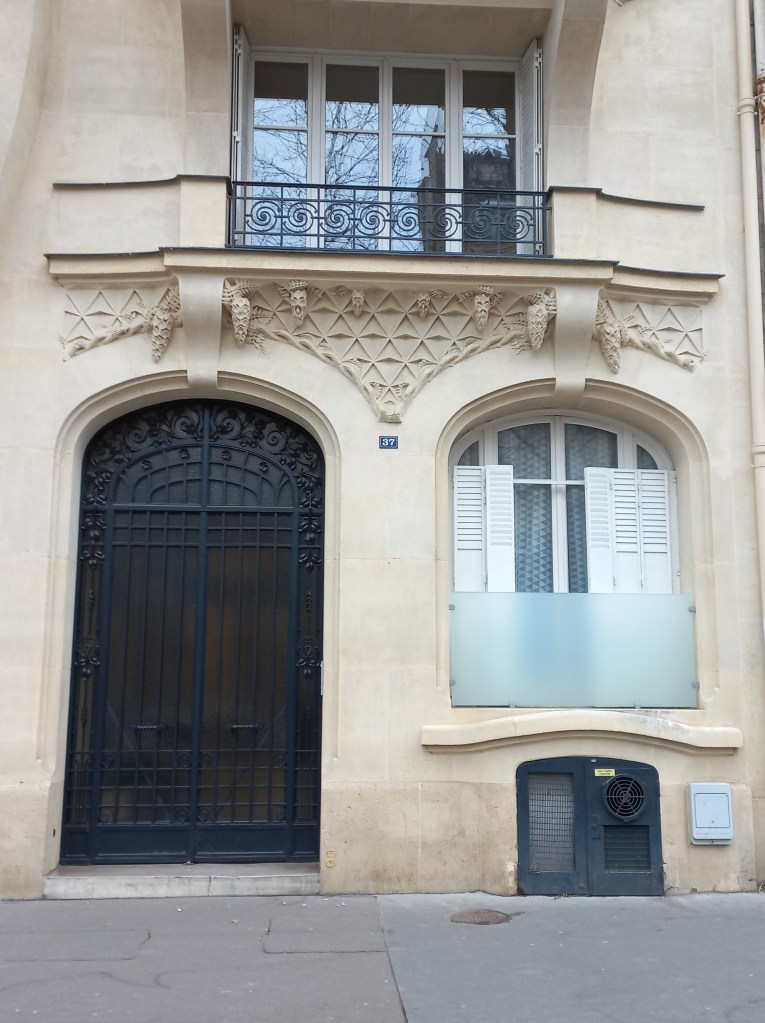 Immeuble construit par Jules Lavirotte en 1901 et primé au concours de façade de la Ville de Paris en 1903. Décor Art nouveau d’une exubérance qui confine au délire avec une surabondance de motifs décoratifs végétaux et surtout aimaliers (cf photos du diaporama ci-dessous). Le décor de l’encadrement de la porte est aussi spectaculaire que dramatique au sens littéral avec cette jeune femme mélancolique et son étole de renard qui pend, un peu sinistre. Une poignée en forme de lézard, des griffons et des cygnes soulignent les ouvertures de la porte dans lesquelles certains voient le dessin d’un sexe masculin. Les décors en grès flammé sont d’Alexandre Bigot.