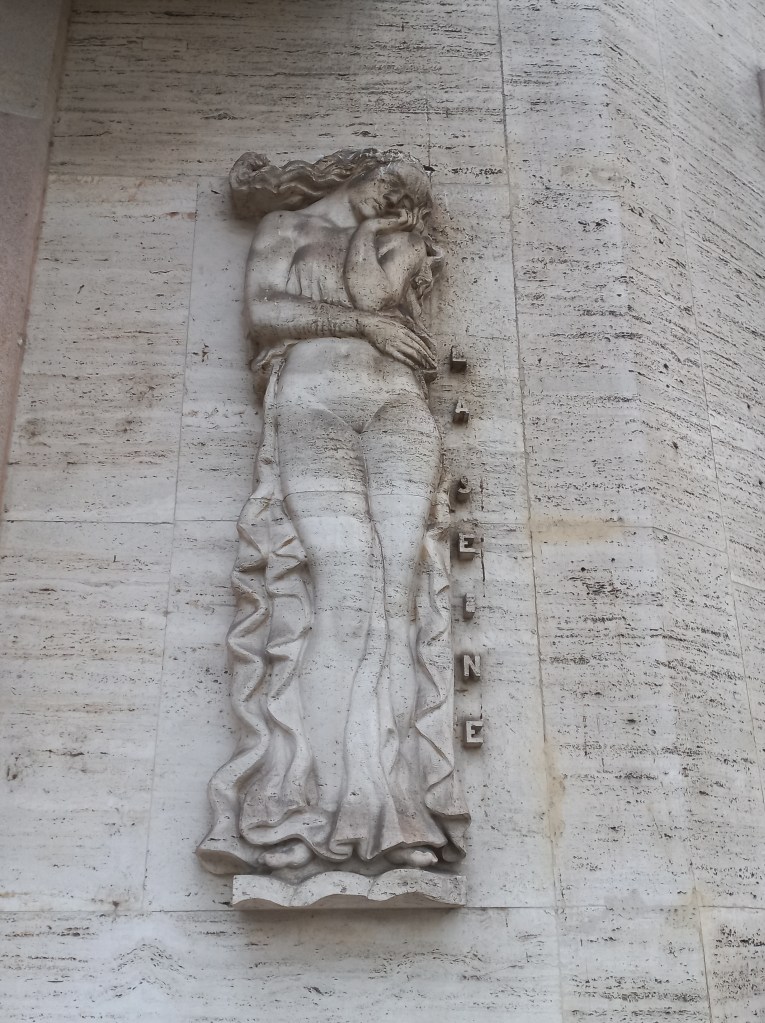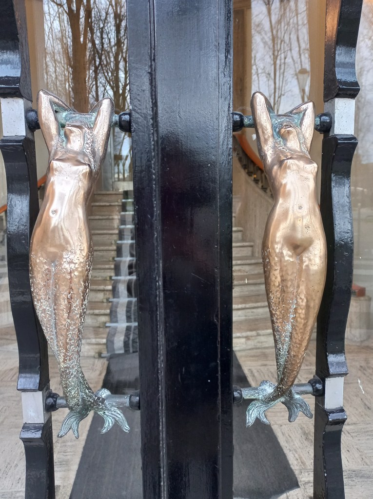 Beautiful Art Deco corner building with rotunda entrance hall. The door decor is dedicated to water, with handles in the shape of mermaids, and the bas-relief on the right depicts an allegory of the Seine. On the left, a bas-relief depicts Eve tempted by the serpent. Architect: André Lecomte. 1935