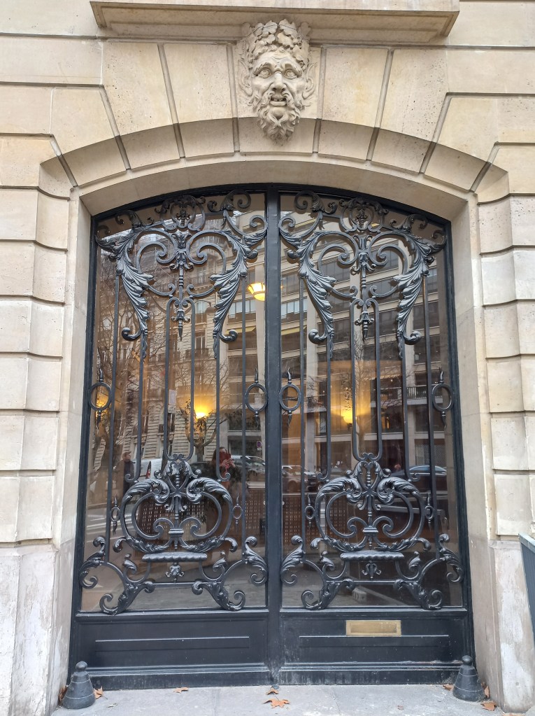 A mascaron depicting a faun with enormous ears. Its twin adorns the building’s second door on the façade facing rue Bugeaud. These two doors open onto a semicircular hall where horse-drawn carriages entered to drop off their passengers under shelter and exited through the opposite door.