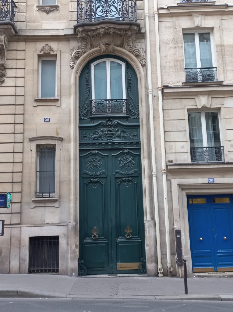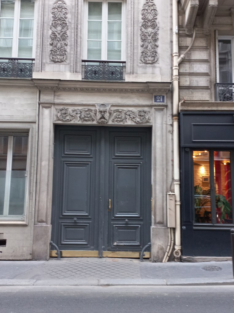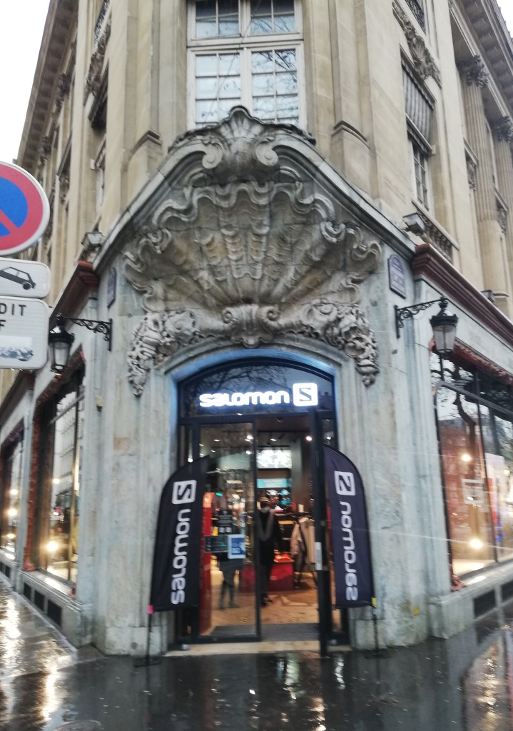 Immense coquille, avec à sa base des coquillages, qui surmonte la porte à l’angle du Boulevard de la Madeleine et de la rue Vignon. Une coquille identique existe à l’angle de l’immeuble et de la rue Godot de Mauroy. Cet immeuble était le siège des Messageries Maritimes jusqu’en 1975, date à laquelle les Messageries ont déménagé à La Défense.